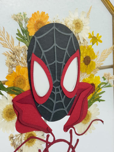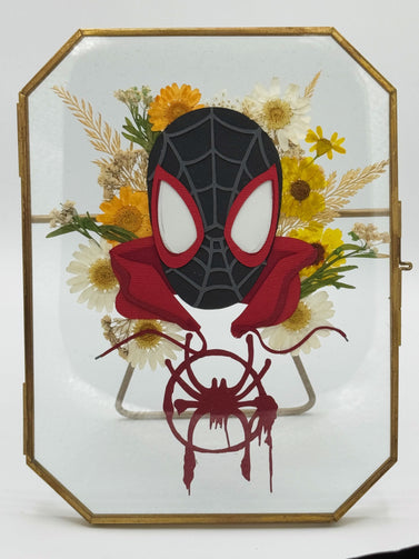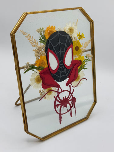 Miles Morales is one of my all time favorite characters and I just love the Into the Spiderverse movie franchise. Miles sits on a bed of dried sunflower like flowers on a gorgeous gold trimmed glass frame.