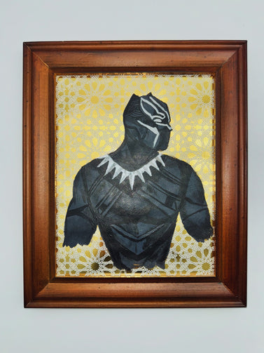 Black Panther painted on a Gold hexagon pattern, wooden frame 8x10